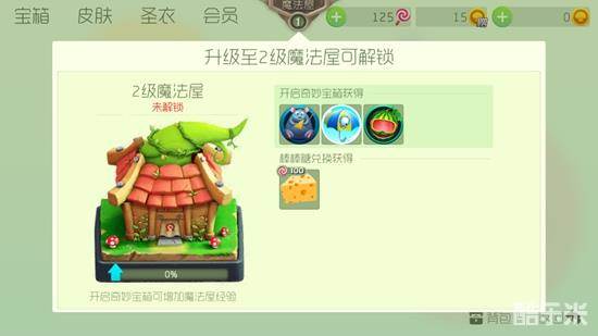 我们点击主页面右下角的“魔法屋”按钮,然后在魔法屋的正上方有等级标志,点击可以打开魔法屋属性,可以看到魔法屋的等级,以及升级后可以解锁的东西。