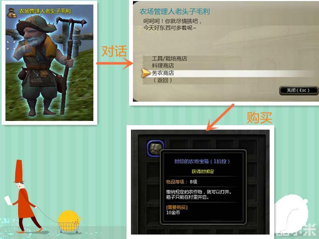 我们可以在农场npc--农场管理人老头子毛利这,进行对话,选择“工具/栽培商店”“务农商店”购买“封印的农场宝箱”