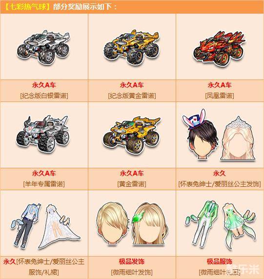 4月29-6月5日期间,购【角色经验卡+700】,必得七彩热气球,有机会得永久A车【纪念版白银雷诺】/【纪念版黄金雷诺】/【凤凰雷诺】/【羊年专属雷诺】/【黄金雷诺】、永久【怀表兔绅士/爱丽丝公主发饰】/【怀表兔绅士/爱丽丝公主服饰/礼裙】或其他奖励之一!其中极品概率范围为:5.2%-6.8%,非极品概率范围为:93.2%-94.8%。