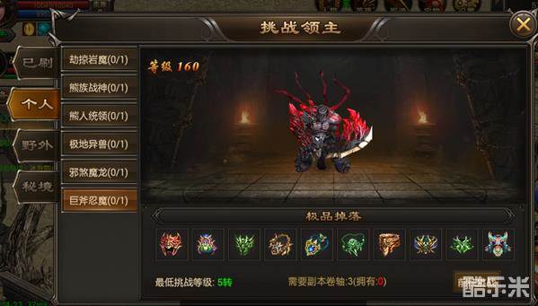 个人BOSS副本的挑战条件为玩家们到达一定的等级,例如:击杀60级BOSS犸法邪灵需要人物等级60级、击杀60级BOSS霜岭巨人需要人物等级62级,击杀90级BOSS灭世魔君需要人物等级70级。玩家的等级越高,可以击杀的BOSS也就越多,别看低阶BOSS产出的装备等级低没太大用处,但低阶BOSS可以高效提供大量的药品、礼券和金币奖励,同样不容错过!