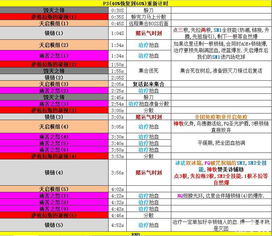 天启1+AOE1的时候灵+治疗祷言爆发抬满团血然后刷新好灵和静准备应对锁链1,锁链1我们安排的是SM1的全技能(因为待会天启2他要死了然后内场吃球),锁链1出3根先拉2根,拉3根直接就灭团了,剩下的1根和AOE1重叠,泄蓝爆发就能度过.然后出萨格拉斯的凝视后我们全团集合死树后,等刀刮完集体复活,同时也规避了锁链2。
