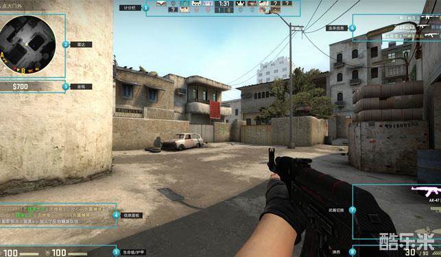 在游戏中按住Tab键,则会弹出计分板,通过计分板可以查看昵称、比分等数据。同时也可以查看每个人的个人数据,从左到右分别为:Ping值、昵称、个人展示徽章、当前金钱、KDA、MVP、个人得分等。左上角为当前配置的音乐盒。