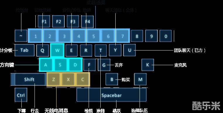 向前移动:W 向后移动:S 向左移动(平移):A 向右移动(平移):D 行走:SHIFT 跳跃:SPACE 下蹲:CTRL 装填弹药:R 上次使用的武器:Q 丢弃武器:G 使用(安装C4\拆除C4):E 检视武器:F | 命令类无线电消息:Z 标准类无线电消息:X 报告类无线电消息:C 团队消息(己方):U 聊天消息(全体):Y 涂鸦:T 使用麦克风:K 购买菜单:B 自动购买:F3 重新购买:F4 计分板:TAB 选择队伍:M | 控制台:` 主武器:1 副武器:2 匕首:3 切换手雷:4 炸弹:5 高爆手雷:6 闪光震撼弹:7 烟雾弹:8 诱饵手雷:9 燃烧瓶:0 |