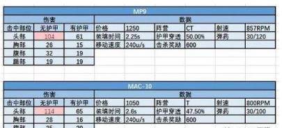 因为两把武器的定位基本相同,只有在具体数值上有着些许差异,我们就将两把武器放在一起来看。作为最廉价的两把微冲,他们拥有着微型冲锋枪最典型的两个特点:高射速、低穿甲。我们在来详细的看一下他们的优劣势。