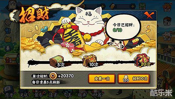 招财:直接有效获取铜币的方式,每日的前两次是可免费招财的,后续想要继续招财则要花费金币。这相对于土豪玩家来说是可实行的获取方式,平民玩家还是通过其他渠道来进行铜币的获取吧。