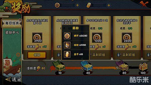 活跃度任务:每天的活跃度达到100即满,在通过每个小任务时会增加铜币,并且在10、40、80、100的活跃度时会赠送额外的铜币。铜币虽然少,但还是需要积少成多。