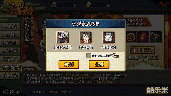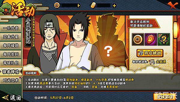 玩家点开活动界面中的强者降临,通过挑战卷开启挑战,使用忍者与npc进行对打,胜利后可随机获得铜币、轮回石和出战忍者图鉴等奖励。
