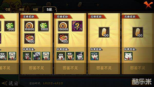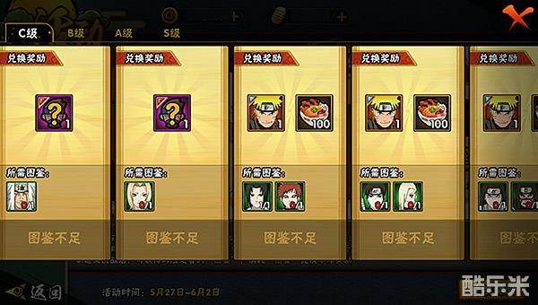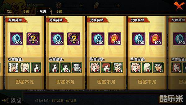 在挑战中获得的忍者图鉴满足兑换条件后,便可兑换到不同的奖励。奖励的等级分为C级、B级、A级和S级。在C级奖励中,单个忍者图鉴兑换的奖励为1个S/A/B级的随机忍者碎片;两个忍者碎片兑换奖励为疾风传鸣人碎片和体力;B级奖励需要3个忍者图鉴,不同忍者图鉴奖励也不同:分为奖励铜币、声望、疾风传鸣人碎片和体力等;A级奖励需要3个忍者图鉴,不同忍者图鉴奖励也不同:分为奖励忍玉、轮回石和一个随机S/A/B级忍者碎片等;而S级奖励中,需要7个忍者图鉴,不同忍者图鉴奖励也不同:分为奖励疾风传鸣人碎片、声望、体力、轮回石、忍玉、铜币和一个随机S/A/B级忍者碎片等。另外,S级奖励中若收集到5个木叶丸军团图鉴和5个福禄丸图鉴,都可以奖励100金币。