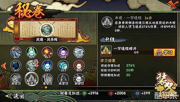 木遁·一字连柱:在身旁两侧各创造三根从地底突起的木桩,将敌人顶飞造成276%伤害,冷却时间20秒。