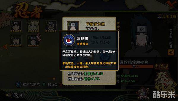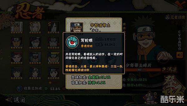 宇智波带土:开启写轮眼后,在一定时间强化自己的攻击性能。普通攻击、火遁·豪火球和集结!三位一队性能强化持续12秒。
