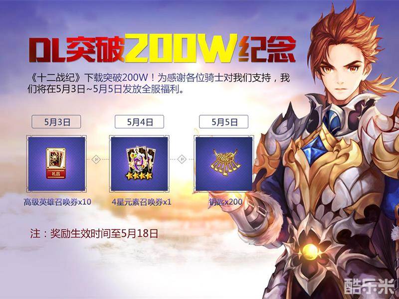 随着国服开启,各位骑士大人日渐活跃在越来越深处的冒险领地和愈加凶猛的无限塔高层,也不断有越来越多的热爱探险的骑士们来到亚斯特大陆上。《十二战纪》凭借着精良的制作、华丽炫目的画面与诚意满满的本地化收获了一大批玩家的热爱。现在《十二战纪》国服注册玩家已经达到200W。为了感谢各位骑士的支持,《十二战纪》官方将在5月3号到5月5号发放全服福利。