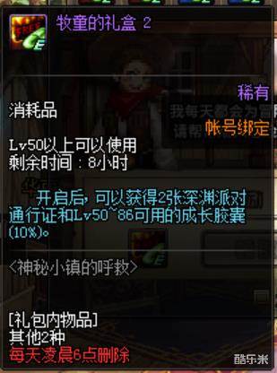 从现在到五一节后,每天上线我们都能领取到一个牧童的礼包,但这个礼包会在每天早上6点统一删除,而开启后的道具则不会,所以在我们把道具领取之后,最好马上开启,不然第二天早上可就没了。