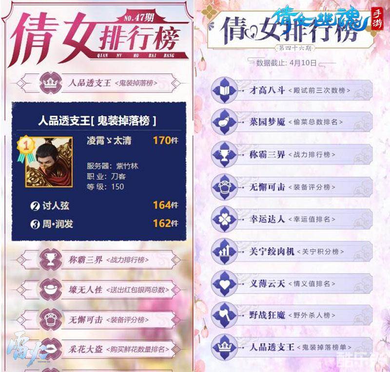 除了有大神分享家园打造的经验外,本期的膜拜榜单还有着更加精彩的看点。来自【紫竹林】服务器的【凌霄ゞ太清】以170件的鬼装掉落成为本期当之无愧的人品透支王。战力榜的第一名依旧由来自【神雕侠侣】服务器战力高达162484的【宛颜轩影】蝉联。同时来自【三生三世】服务器的【轩辕v紫嫣】更是5745次应战门派挑战,成为了本期的迎战狂人其他更多精彩排行,尽在本期膜拜榜!