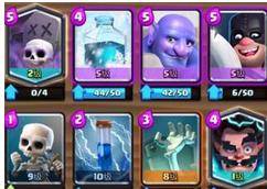 卡组简介:思路很简单就是靠骷髅召唤的高爆发取塔,冰冻法术强控制抢时间,其他加入了能有效阻挡规模军队的AOE卡牌、眩晕单体的电法及小费的过牌。