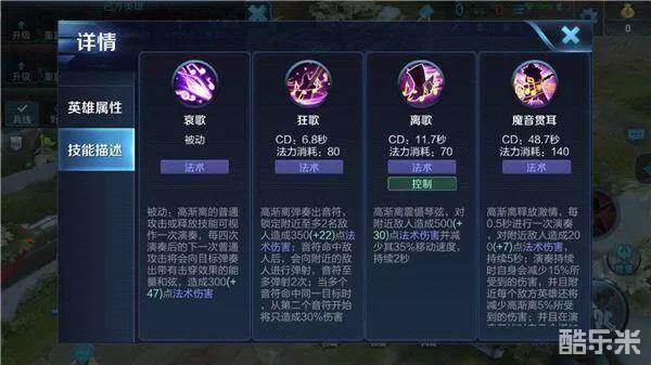 解析:在一定的时间内,高渐离快速进行演奏,对附近的敌方单位造成一定的法术伤害。该技能为高渐离的主要输出技能,亦是其最大优势的来源。同时当高渐离使用该技能时,在一定的时间内会获得一定的免伤能力,免伤能力与附近的敌方英雄成正比,附近的敌方英雄越多,高渐离的生存能力便越强,在选择购买一定的防御装备时,高渐离亦能在打出爆炸伤害的同时承担一名坦克英雄的职责,吸引敌方英雄的第一波技能伤害。且高渐离在使用该技能的瞬间会获得极高的移动速度的加成,虽然会不断衰减,但足以保证高渐离在没有位移技能时迅速的接近敌方英雄。