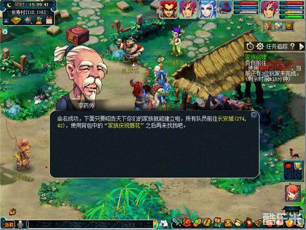 完成创建任务后,找长寿村(113,120)李药师对话,即可完成家族创建,创建成功后,队长玩家将成为家族族长。每个家族最多容纳12名成员。