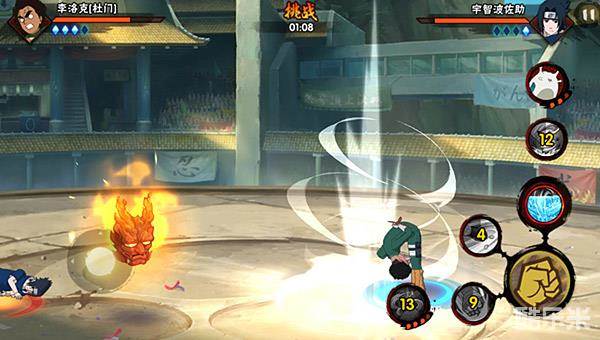 技能方面,迈特凯与杜门李均有着强力快速的突进。凯的动力前奏曲是向前进行一个飞踢,命中后会浮空敌人,可用来进行起手。该技能类似于杜门李的木叶烈风,但相比起来,迈特凯的动力前奏曲比木叶烈风整体的攻击距离要稍远一些。木叶刚力旋风是个范围释放技能,对X轴和Y轴上的敌人均能命中。这就让他在面对一些跑图猥琐忍者中,能有效的进行压制。杜门李的木叶烈风,虽距离稍短,但也可作为突进。而流星叩这个技能,释放后,以迅捷的三连击来回的穿梭,最后腾空一拳能浮空对手,该攻击触发的一瞬间可打得对手措手不及,让敌人难以勘破。