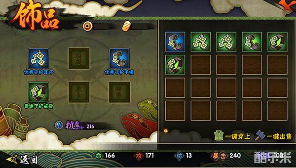 由于饰品会提供给佩戴者随机条数的随机属性,所以我们可以根据战斗的场景需求和忍者各自的优缺来进行属性的弥补。如:在进行秘境探险时,我们需要佩戴高抗魔值的装备,降低副本难度。在其它战斗场景中,抗魔值便可以忽视,集中来提升生命、攻击、防御、抗暴、暴击五种属性。