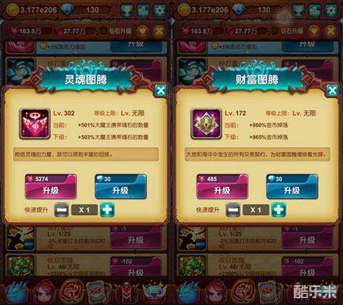 对于热爱闯关的勇者们来说灵魂图腾跟财富图腾两个图腾绝对是优先选择的目标,这两个图腾一个代表获得魂石的数量,一个代表获得金币的数量,对于经常转生的各位勇者来说,这两个无疑是最重要的,当拥有一定级别的灵魂与财富图腾后,转生挂机获得的收益将是巨大的,再配合魂石克隆,绝对爽到爆!