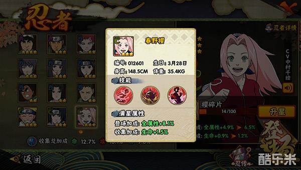 使用技巧:春野樱C级忍者,单个技能伤害一般,但使用打击感良好,技能和普通攻击之间的衔接也很流畅,并且还可以做到无限连。使用春野樱在PVP决斗中要依靠起手技能命中,或者使用压制性秘卷技能,春野樱不适合做防守、猥琐型忍者来使用,要掌握好突进时机,才能打出最大伤害,技能起手后一套普攻打满伤害,然后技能CD又会好,继续使用铁球陷阱封锁走位。