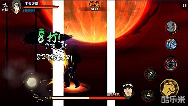 佐助-疾风传的奥义技能也可以分为2段,第1段是雷落,伤害较低,第2段是麒麟爆炸,伤害很高。所以建议在雷落释放到一半,也就是佐助-疾风传喊完那段话之后使用替身术。