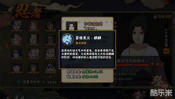 雷遁奥义-麒麟:在原地引动大气中的雷电,在自身周围产生大面积的雷落,之后再将雷电之力化为麒麟的形状,对地面的敌人造成毁灭性的打击。该技能伤害很爆炸,范围同样是全屏,前摇较短。
