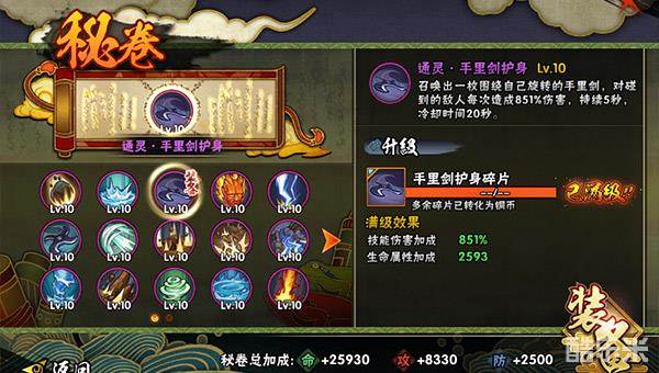 佐助-疾风传本身拥有着很好的输出和消耗技能,所以推荐携带自我保护型秘卷技能或控制型秘卷技能,避免被刺客忍者贴脸打一套。如:通灵-手里剑护身、水遁-水冲波、通灵-雷光剑化、木遁-扦插之术。