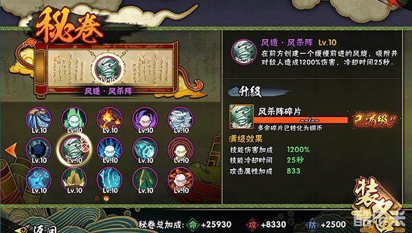 风遁-风沙阵:虽然该秘卷技能的CD稍长,但这丝毫不影响它的强势。无论是伤害还是范围在所有秘卷技能中都是数一数二。风沙阵的满级效果为吸附敌人并造成1200%的伤害,CD为25秒,而且可以很好的搭配绝大多数的忍者。所以在遇到飞天忍者时,不要忘了带上它。