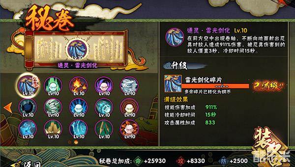 雷光剑化虽然攻击范围不是很远也不是很大,但其只要攻击到敌人,敌人便会进入僵直状态,且该秘卷技能前摇很短,几乎是瞬发,朝着敌人头上扔过去对方根本反应不过来,要么被僵直,要么只能交掉替身术。如果对方没有替身术被僵直,那么我们可以在3秒的时间里迅速接上自己的一套技能或者平A,如果对方选择交掉替身术,则我们接下来的十几秒就可以肆无忌惮的施放奥义技能而不用担心被敌方用替身术躲掉。其满级伤害为911%,CD为15秒。
