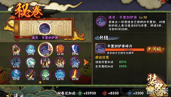 手里剑护身是一款很好的用来保护自身的秘卷技能,无论你是技能消耗型忍者还是平A型忍者,其都是非常好的秘卷搭配。甚至于你是突进型忍者,其也可以作为起手技能来打断对方的节奏,为接下来的突进做准备。其满级伤害为851%,持续5秒,CD为20秒。