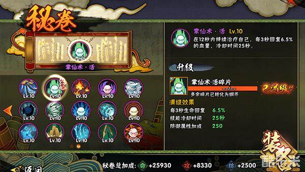 无论你是什么类型的忍者,你都有气血上限,血量占优势的一方才是最后的赢家。而掌仙术-活的满级效果为在12秒的时间里持续回血,每3秒回复6.5%的气血,CD为25秒,意味着12秒总回血量为26%,全场60秒可以施放2次,总回血量达到了52%,可以说是直接领先了对手半管血。所以,这款秘卷技能同样百搭。使用时要注意不要等到自己快没血了再施放,因为施法时间长达12秒,且CD为25秒,前23秒(60-12-25)里一定要使用一次,这样才能保证第二次施放时12秒全部有效(12秒全部在60秒时间内),以便达到最好的回血效果。