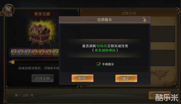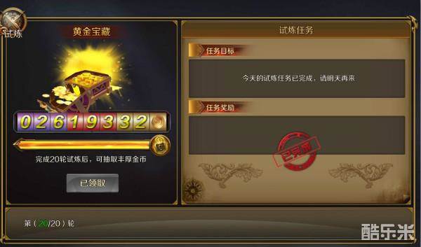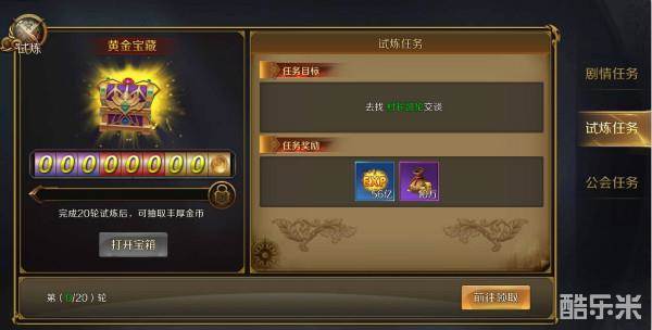每日会有20个试炼任务,完成任务,完成20个任务后可以开取宝箱随机获得金币奖励。