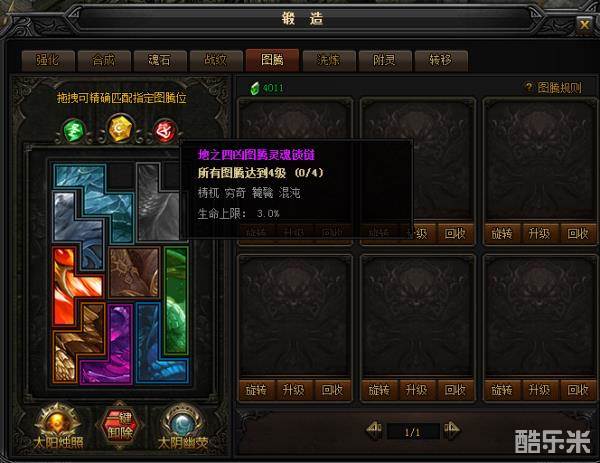 好了,我们四大神兽的组合可能讲到这里,接下来讲上古四大凶兽的一个组合,组建起来会有哪些新技能,当梼杌图腾,穷奇图腾,饕餮图腾,混沌图腾集合集齐在一起的时候,生命值将会有新的爆发突破,将提升人物的生命值,有助于我们在游戏里面更加的耐扛,激活这个技能需要我们四大凶兽的图腾都提升到4级就可以激活的,提升等级的方式有,可以去位面探险获得图腾精华这些,还有游戏里面的特殊活动寻宝有几率获得的图腾,可以选择性多的进行回收获 得图腾经验,来进行升级。