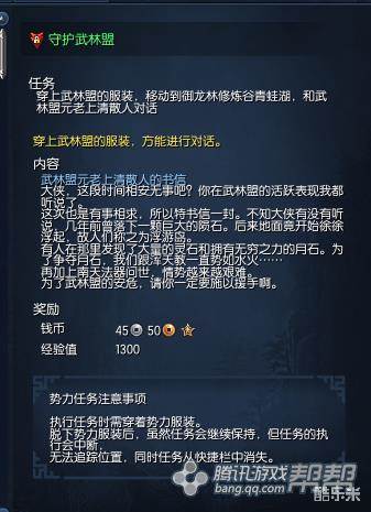 入场条件比较简单,只需要完成“守护武林盟/浑天教”任务(按J键打开任务列表即可领取),就能获得进入浮游岛的入场权限,但是必须穿戴武林盟/浑天教的势力服装才能传送进去。