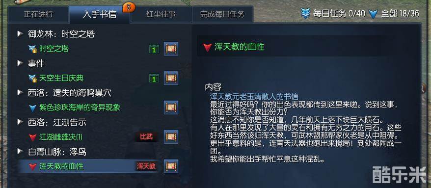 入手书信一览中可以看到浑天教的势力任务,且分类为白清山脉:浮岛。