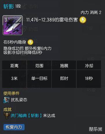 最常用的进隐身方式之一,优点是降吸影冷却时间 6秒,缺点是冷却时间为18秒,使用时会有间隔,通常每2轮隐身能用到一次斩影;另外就是这个技能完全没有后摇,而它和无影步的键位同为3,不多加练习的话偶尔会出现斩影接无影步的失误操作,影响输出。如果使用青月神功牌和仙伦秘功牌,需要尽量在吸影处于正在冷却的状态下再使用这个技能进隐身。