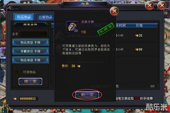 1、点击拍卖行按钮,可打开拍卖行界面,玩家可在此界面中出售或购买物品;