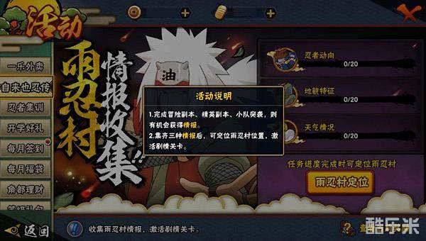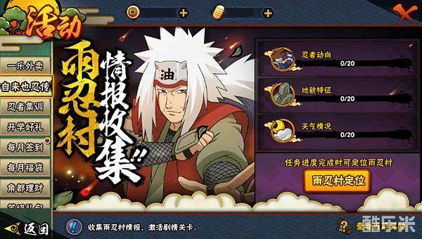 定位雨忍村:本关卡的任务有两个,第一是要收集3种雨忍村情报,随后才能解锁对应的挑战任务。情报可以通过冒险副本、精英副本、小队突袭等任务刷取。挑战任务中玩家会面临纲手、静音的挑战,敌人的伤害并不是很高,但大家需要注意在规定的时间内完成任务。