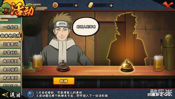 抓捕雨忍:进入本关卡后,玩家面前会随机刷新“雨忍”或“客人”,如果碰到客人则玩家需要花费一定的铜币将其送走,而如果遇到“雨忍”则实施抓捕行动。在战斗中,自来也需要使用“蛤蟆”抓捕敌人,抓捕2批之后即可完成任务并领取奖励。