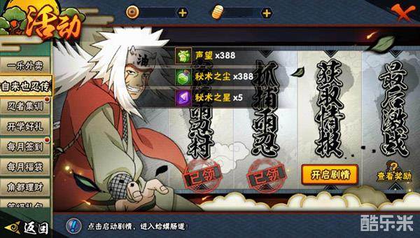 在“自来也忍传”活动中,系统共提供了4段不同的剧情,分别为:“定位雨忍村”、“抓捕雨忍”、“获取情报”、“最后激战”。玩家每开启一段剧情便可解锁对应的剧情任务,完成剧情任务可以获得丰厚的奖励,每段剧情的任务奖励都不尽相同,越是能战到最后,奖励也将越丰厚。