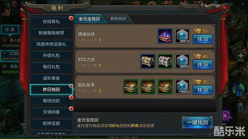 如果忘记参加昨天的日常活动任务,可以在福利系统下的“昨日找回”进行找回奖励和经验。找回分为金元宝和铜钱两种找回方式,使用金元宝可以找回活动的100%经验和所有活动资源,使用铜钱可找回60%的经验。找回的经验和资源奖励越多,花费的金元宝或铜钱越多,金元宝找回比较适合氪金玩家,铜钱找回则适合普通玩家。