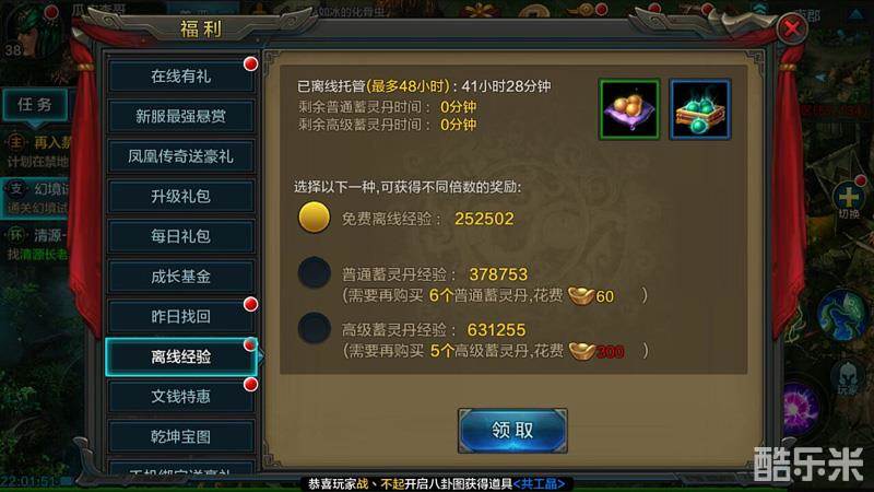 在福利系统中还有离线经验可以领取,在离线的时候会自动托管,系统会自动存储一部分离线经验,离线经验的存储上限48小时,只要在2天以内登录游戏就不会存满。离线经验的提取分为免费领取、普通蓄灵丹领取和高级蓄灵丹领取,一颗蓄灵丹可以存储8个小时的离线经验,普通蓄灵丹会增加50%经验,高级蓄灵丹会增加150%经验。如果急于追赶等级,建议使用蓄灵丹领取,普通蓄灵丹一颗是10元宝,性价比很高,高级蓄灵丹一颗60元宝,是氪金党的首选。
