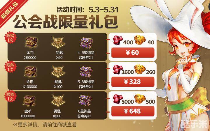 此次更新后,《十二战纪》官方还推出了公会战限时礼包。玩家购买礼包除了可以获取红钻和黄钻之外,还能获得额外的召唤券、精灵、钥匙、金币等奖励,能帮助各位骑士大人进一步提升实力。