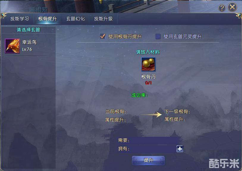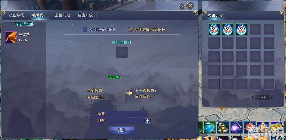 至于使用元灵来提升根骨只有一点需要注意,提升的元灵等级须大于强化的玄兽等级,简单的说就是熊猫元灵不能用来强化凤凰和兔子,但兔子和凤凰可以强化熊猫,就是这么简单。