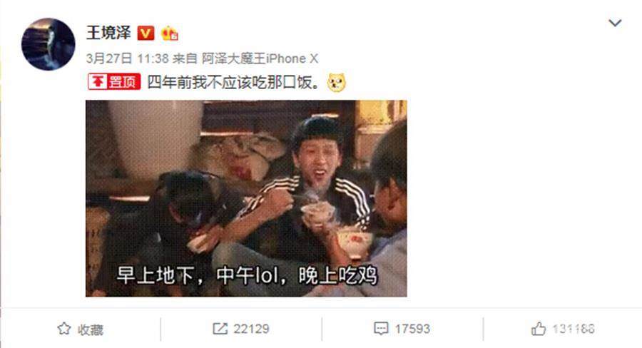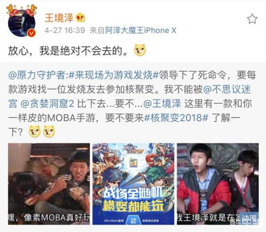 而《原力守护者》可以说思路很清奇了,独独看上了王境泽。翻阅王境泽的微博我们也会发现,他和其他男孩子一样,爱玩游戏,尤其是MOBA游戏。微博置顶至今仍然是关于《英雄联盟》的表情包,足见其对MOBA类游戏的热爱程度。也正因为如此,王境泽也就被《原力守护者》的小编盯上了…