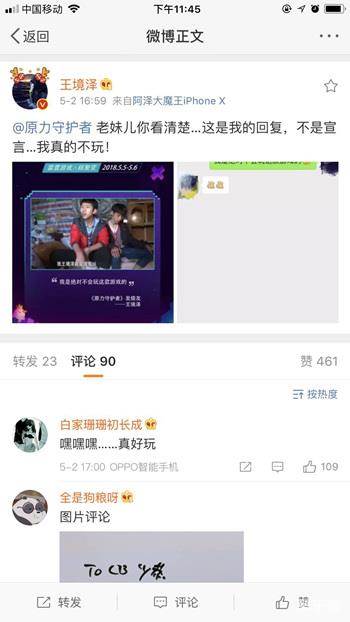 而在官方将海报发布之后,王境泽立马跳出来澄清了。到底”我是绝对不会玩这款游戏的”这句话是宣言还是拒绝呢?是真不玩还是假不玩呢?这立下的一个又一个的flag,吃瓜群众表示围观得很欢乐。