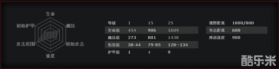 上图是冰女的基础属性角图和一些确切的数值,从图中分析可得冰女具有超级优良的攻击范围,中可的护甲和初始攻击,相对充足的魔法,这些放到一起,一个前期线上压制能力极强的酱油便诞生了,利用自身的超远距离弹道,足够的魔法,可以在前期优势路保大哥或者劣势路刚三中发挥很大的优势,甚至可以将对面的英雄压出经验区。