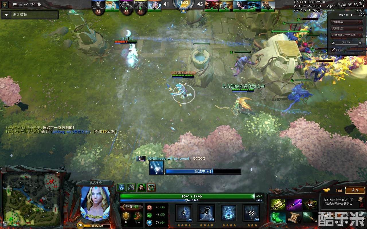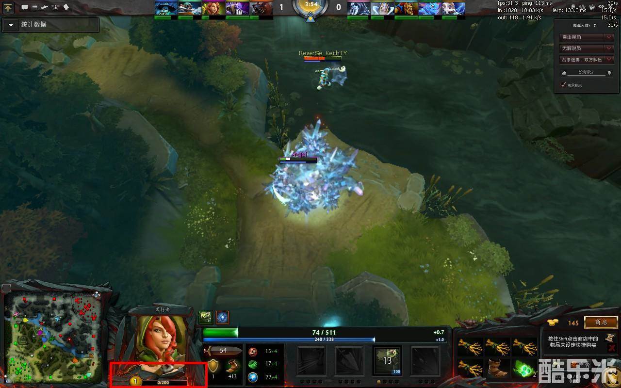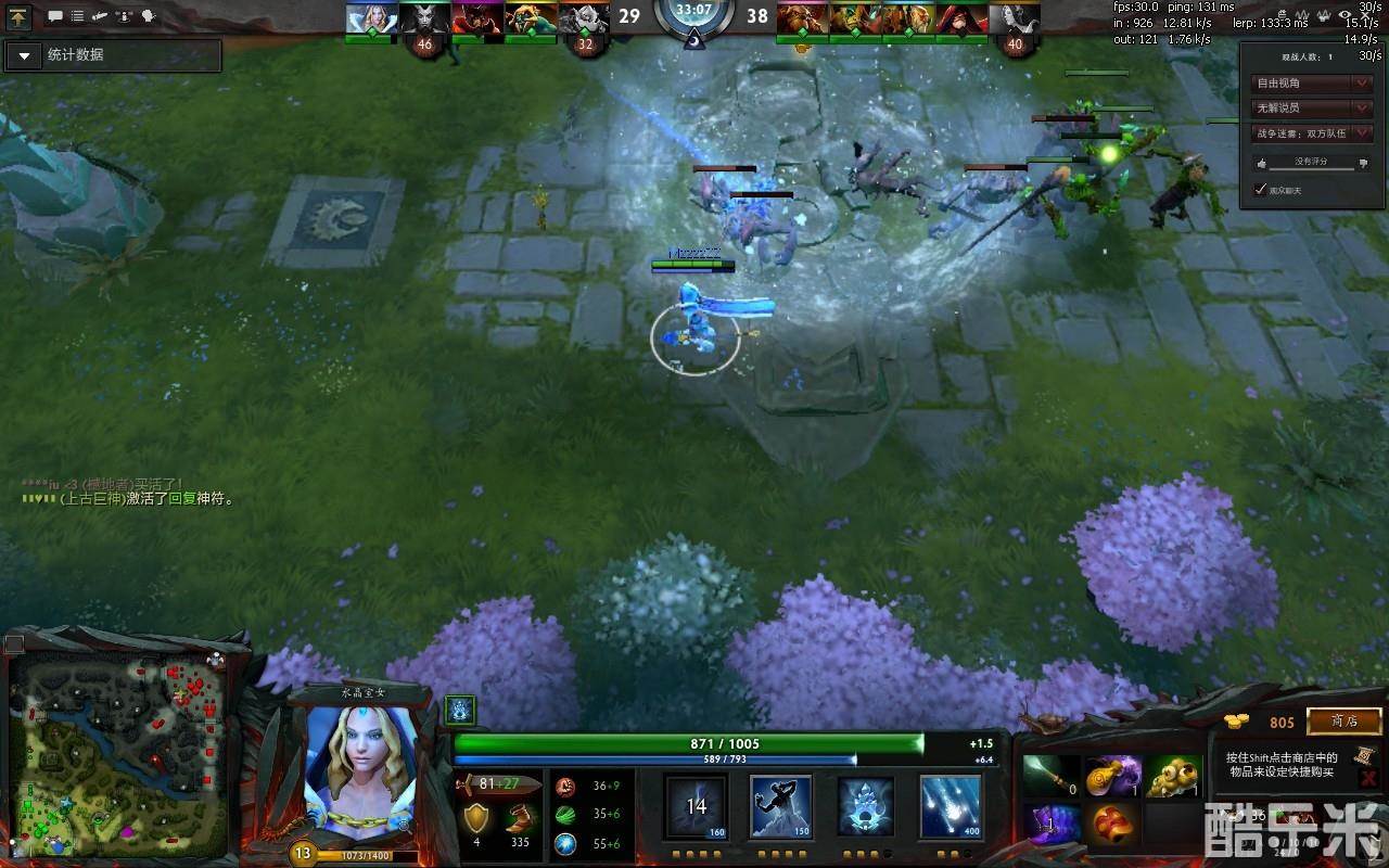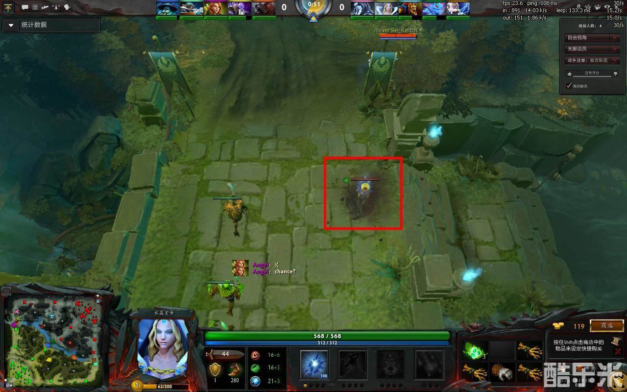 该图中的冰女躲了一个高坡视野放大,但是对面的英雄都出到了bkb,很尴尬没有什么输出,如果对面没有开启bkb该次放大应该起到良好的效果。