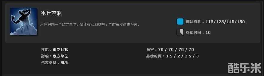 冰女的第二个技能是一个点控制——冰封禁制,用冰包围一个敌方单位,禁止移动和攻击,同时每秒造成70点伤害,持续时间1.5/2/2.5/3,魔法消耗115/125/140/150,施法距离如图12所示,该技能的施法距离由于是禁足,明显比第一技能距离要近很多,而且持续时间要短,但是在该技能的控制时间内,敌方单位无法移动和攻击,这就给很多前期冲脸强势的近战物理英雄带来了麻烦,满级长达3秒的控制看上去相当致命。