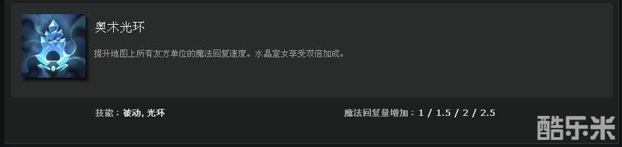 奥术光环是冰女的第三个技能,也是冰女唯一一个被动技能,触发范围为全地图,魔法回复量增加1/1.5/2/2.5,该技能在团战至上的今天可谓是一个神技,有了这个技能让很多英雄有了持续的续航,不必经常回泉水或者用小鸟运送小净化,其团队回复效果可见一斑。当冰女升级了该技能后,只要冰女活着,所有队员的被动buf栏就会有一个光环buf,同时魔法值得到回复,如下图,分别为低等级的buf和高等级的buf。前期点几级奥术光环可以确保后期的线上蓝量回复,也能使自己的技能释放更加流畅,对对面的压制更加明显。